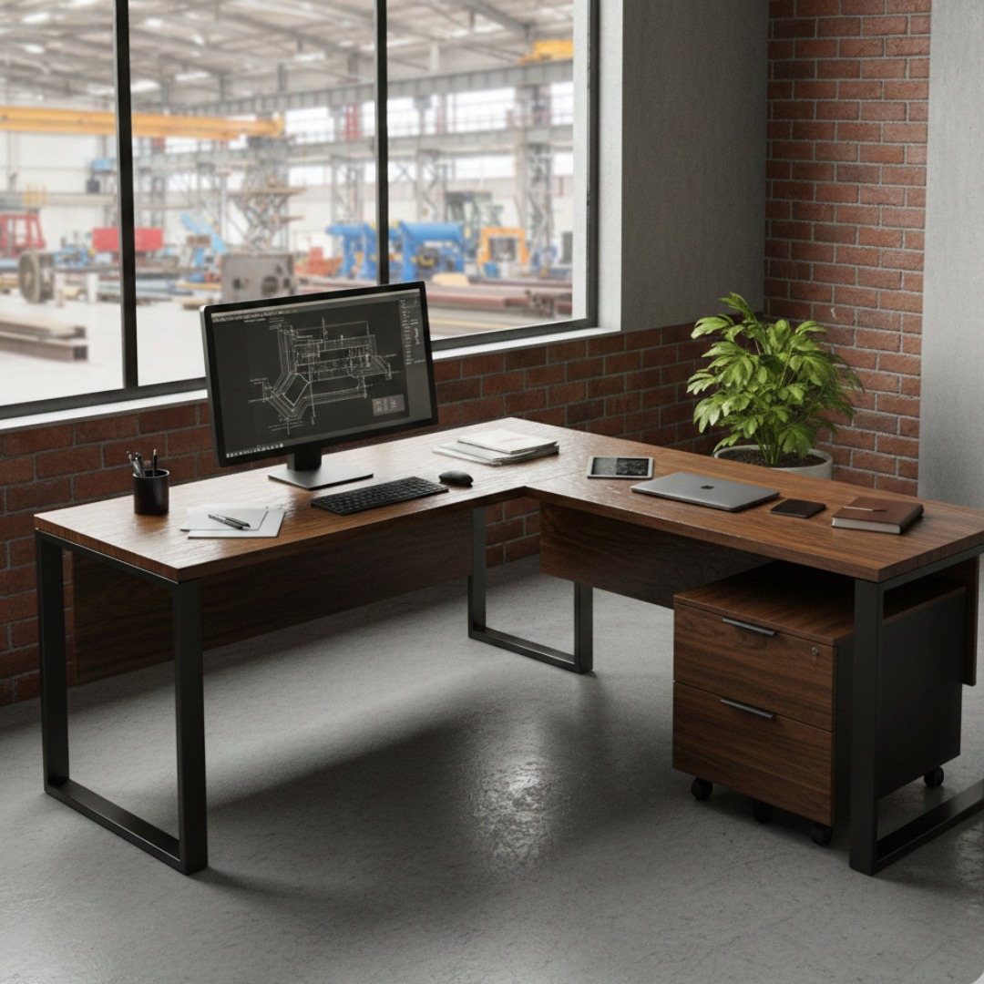 Los Escritorios en L ofrecen superficie amplia para estaciones de trabajo con múltiples monitores, estructura reforzada con herrajes industriales que aseguran estabilidad junto con capacidad de carga adecuada para equipos de cómputo y documentación técnica; la configuración en L facilita la zonificación de tareas, separando la zona principal de trabajo de un área auxiliar destinada a archivos o equipos, lo que optimiza el uso del espacio en oficinas compactas o puestos de ingeniería.